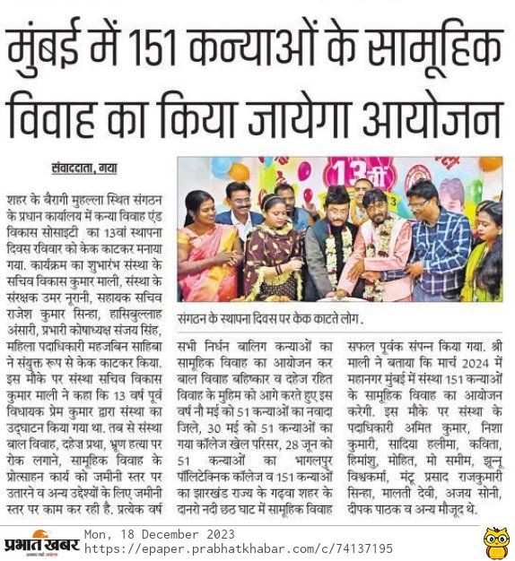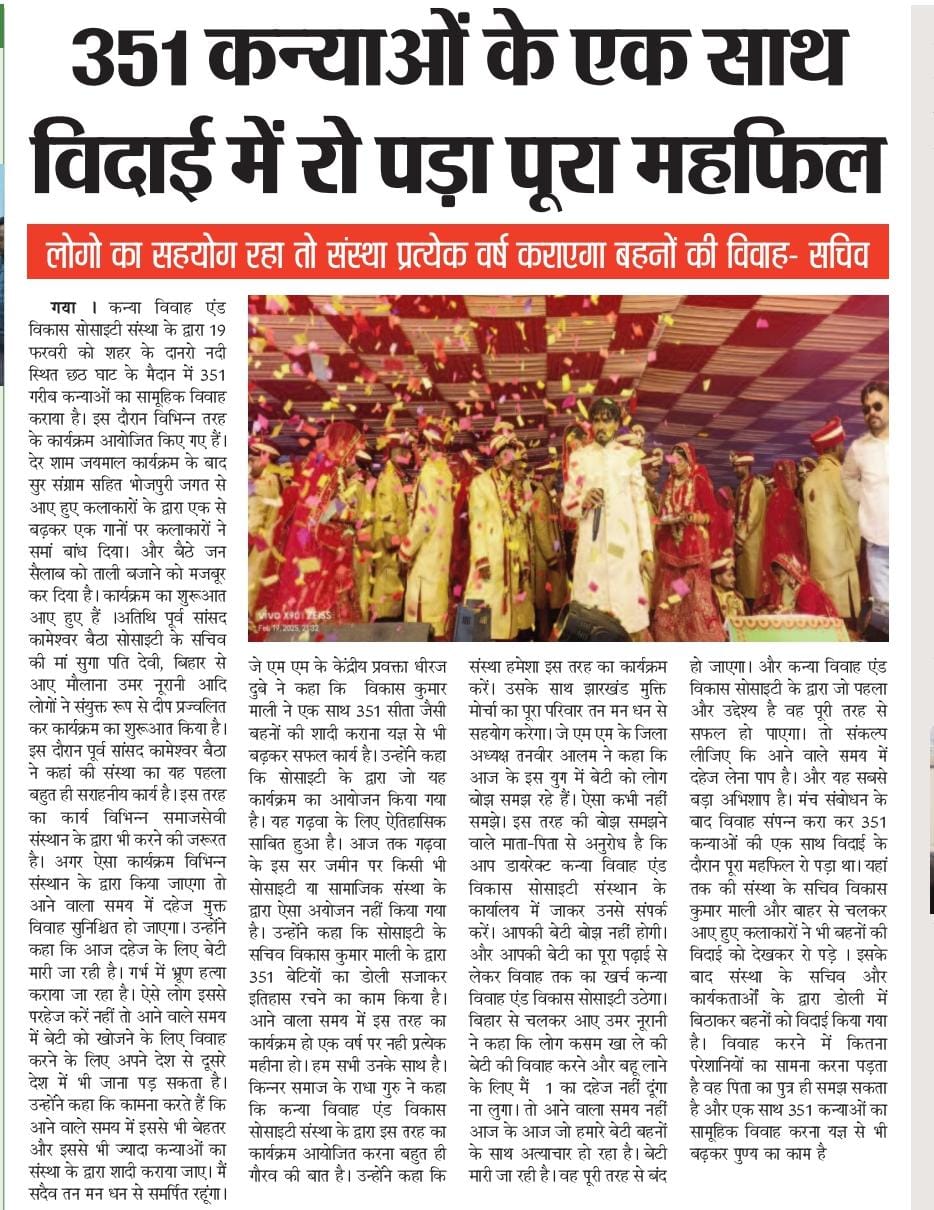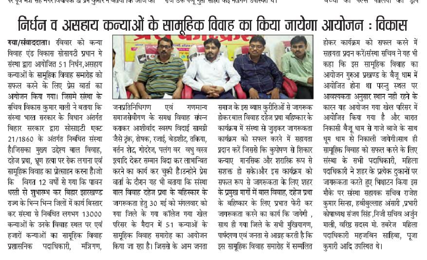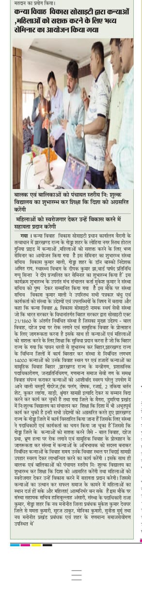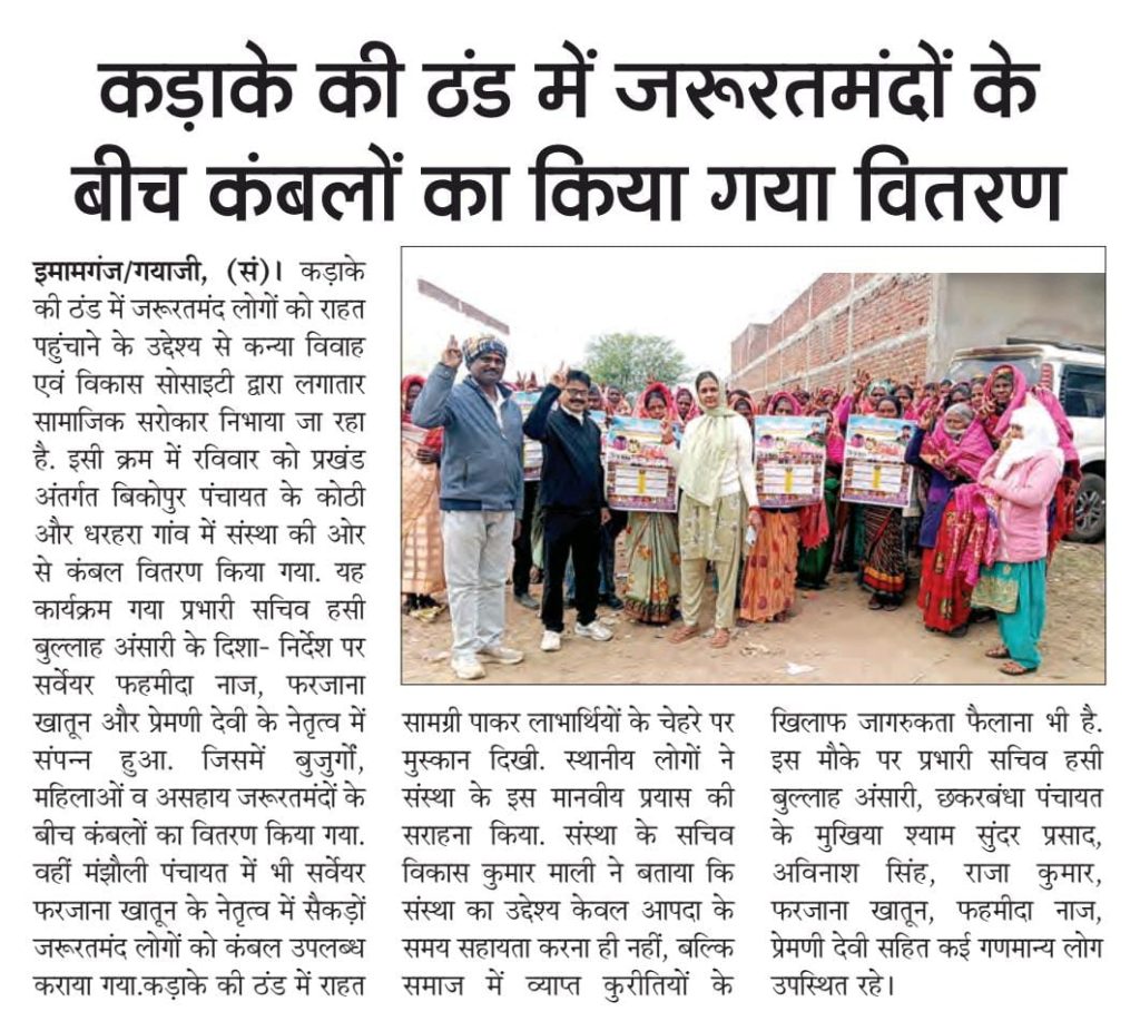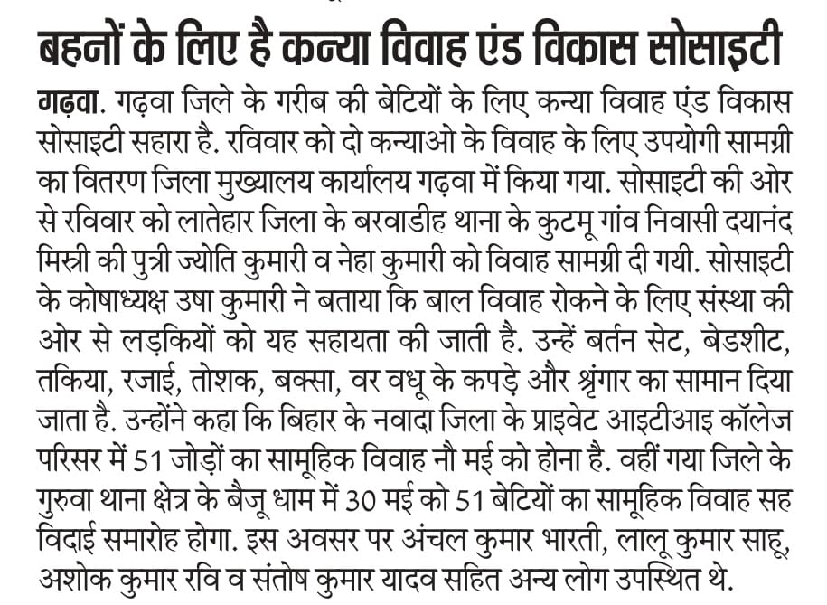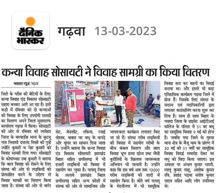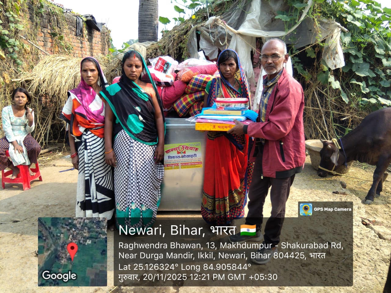 कन्या विवाह & विकास सोसाईटी द्वारा गया जिले के आमस प्रखण्ड में नवविवाहित कन्याओं के घर पर संस्था के प्रभारी पदाधिकारी संजय कुमार सिंह एवं सर्वेयर हिमांशु सिन्हा के द्वारा विदाई सामग्री