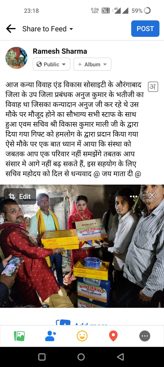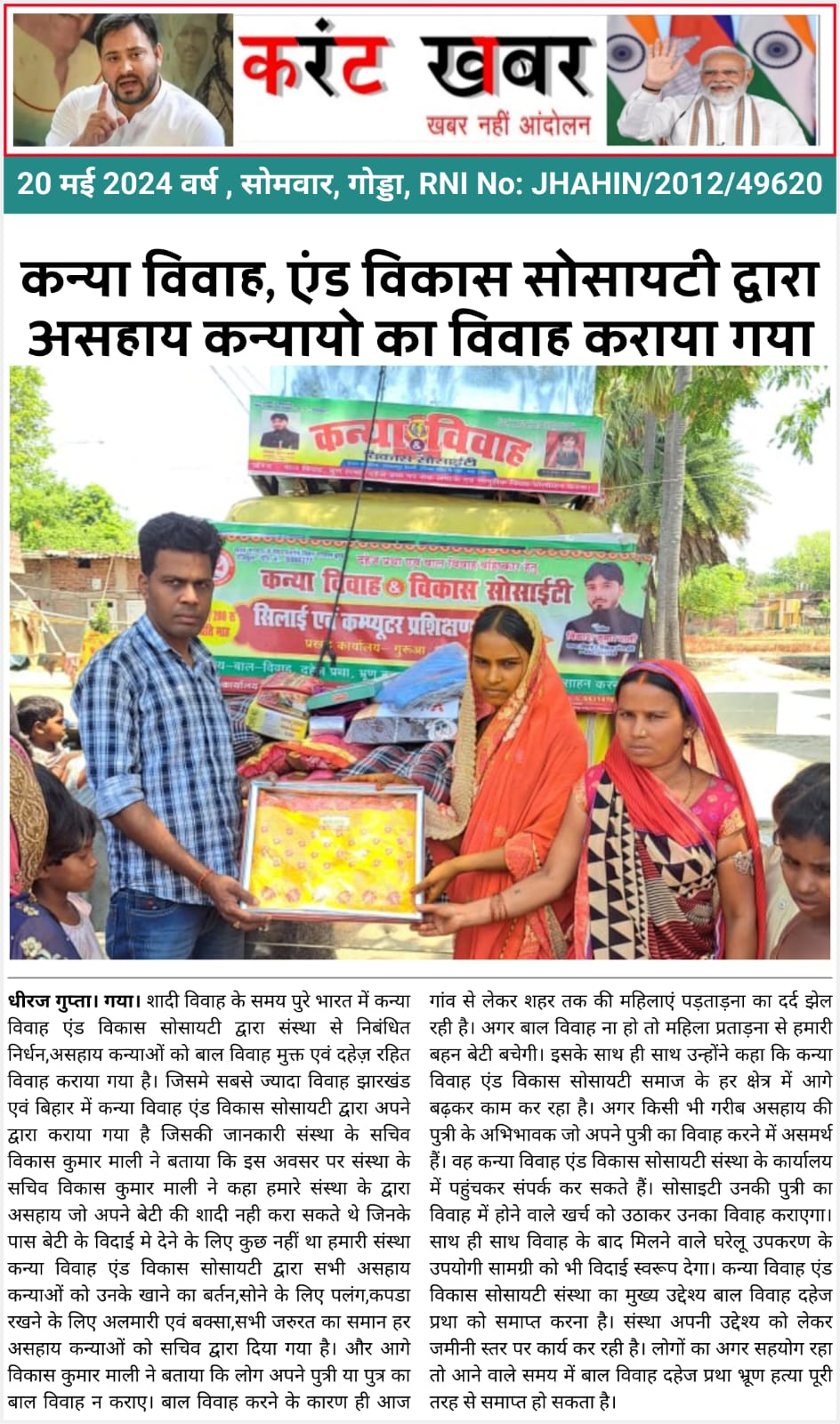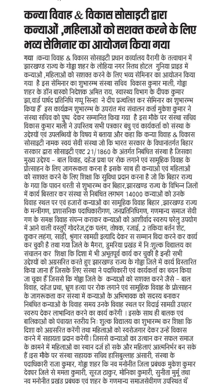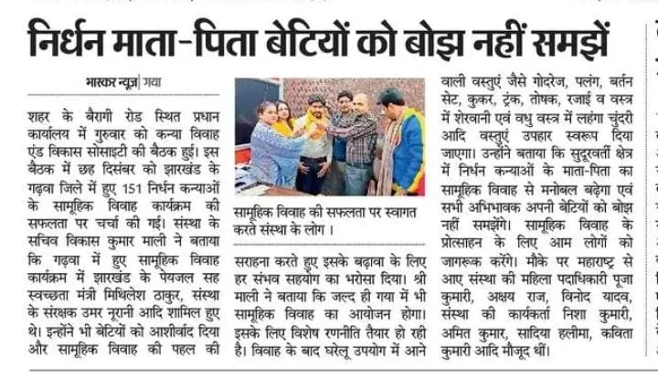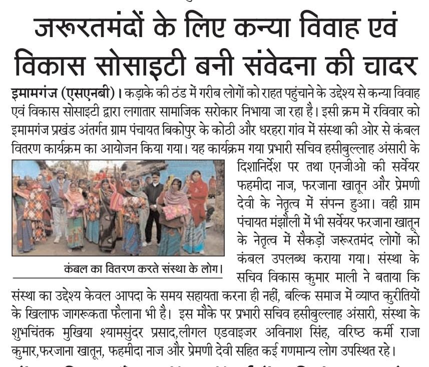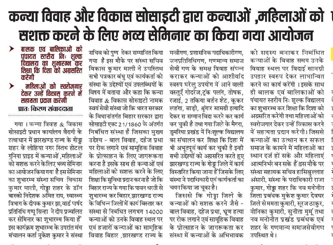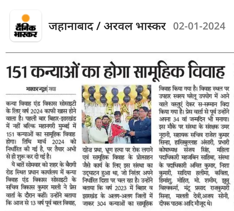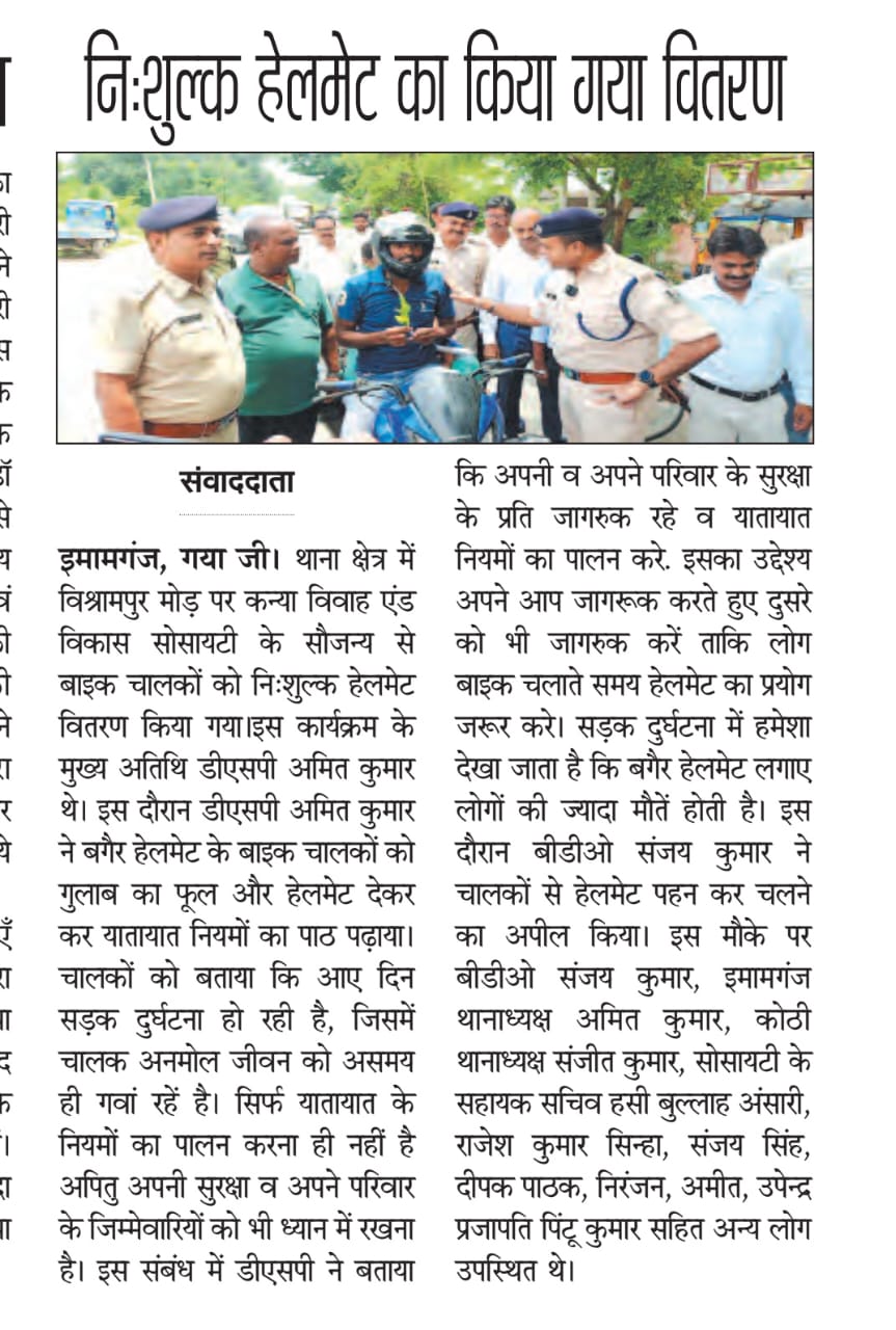 कन्या विवाह & विकास सोसाईटी द्वारा गया जिले के आमस प्रखण्ड में नवविवाहित कन्याओं के घर पर संस्था के प्रभारी पदाधिकारी संजय कुमार सिंह एवं सर्वेयर हिमांशु सिन्हा के द्वारा विदाई सामग्री