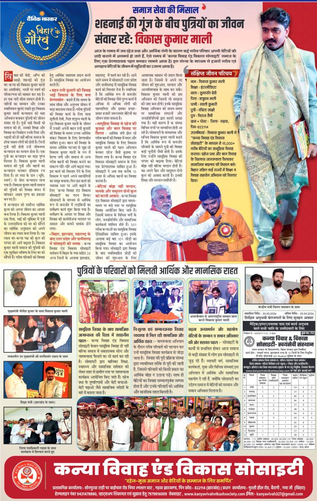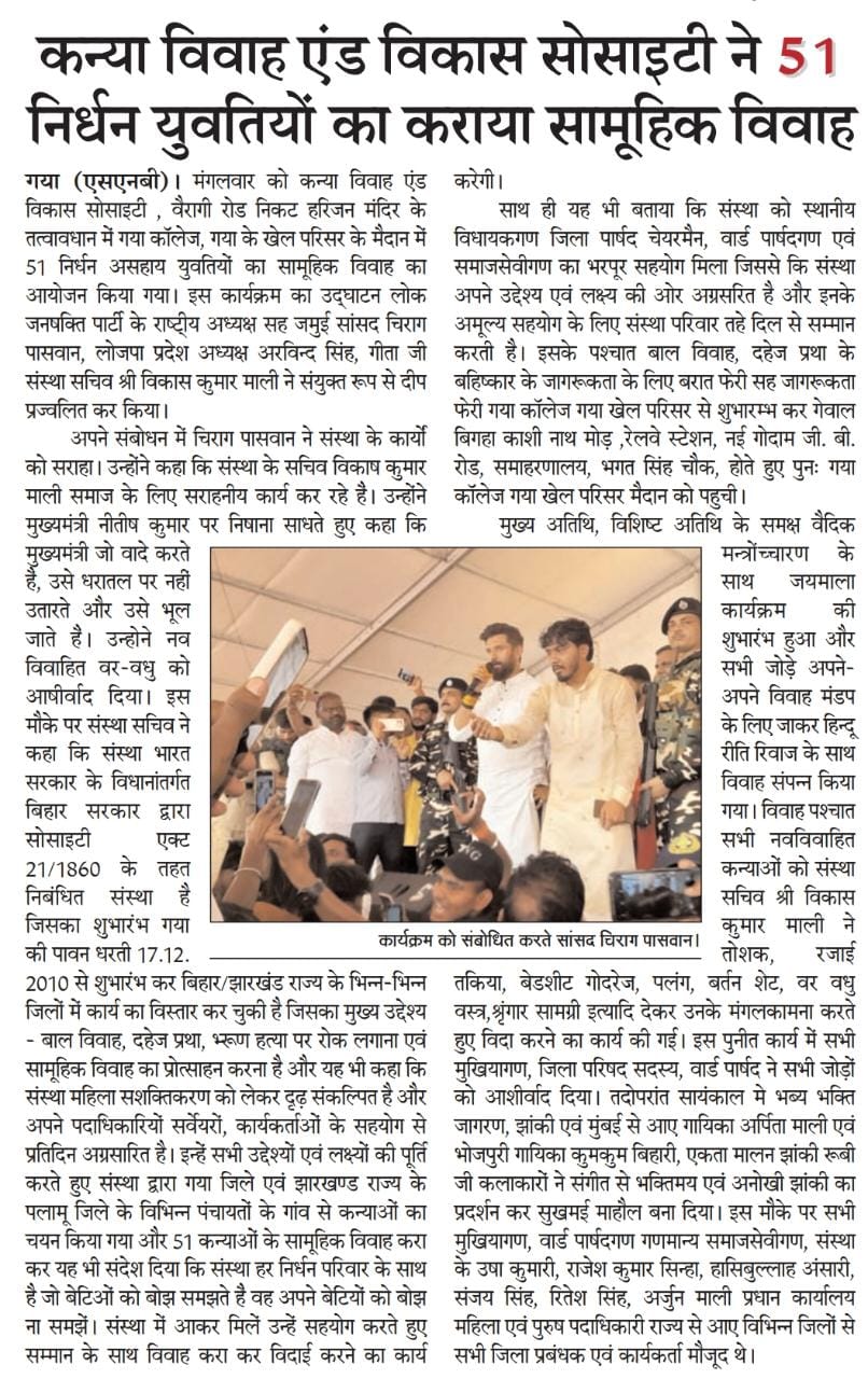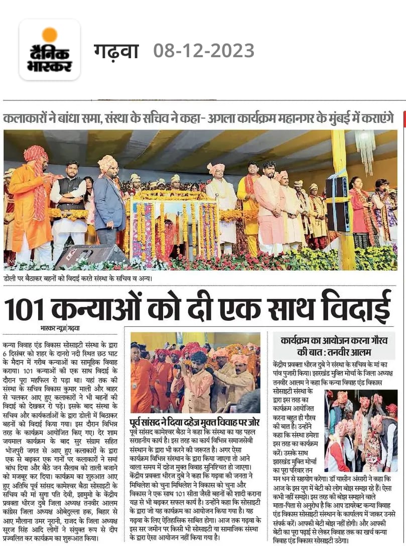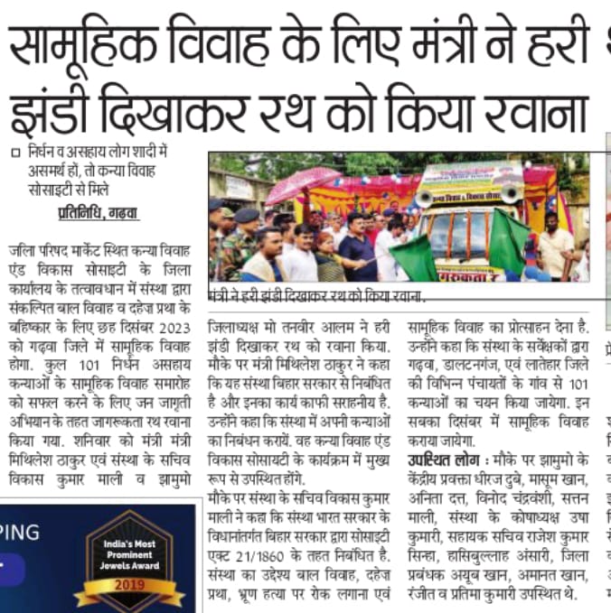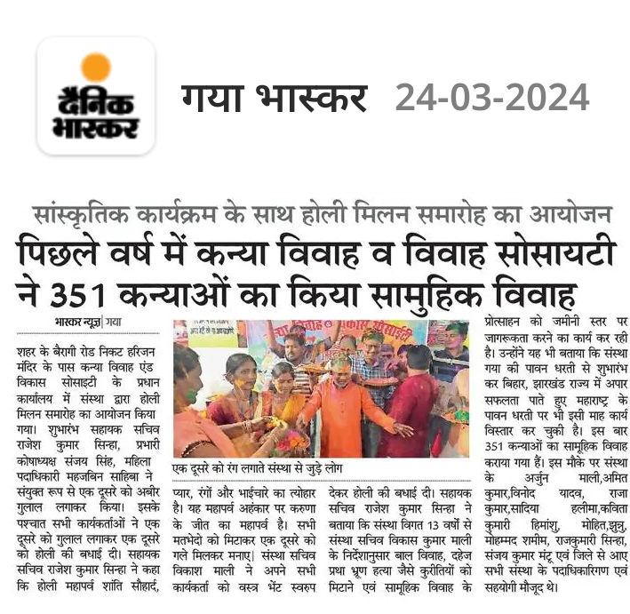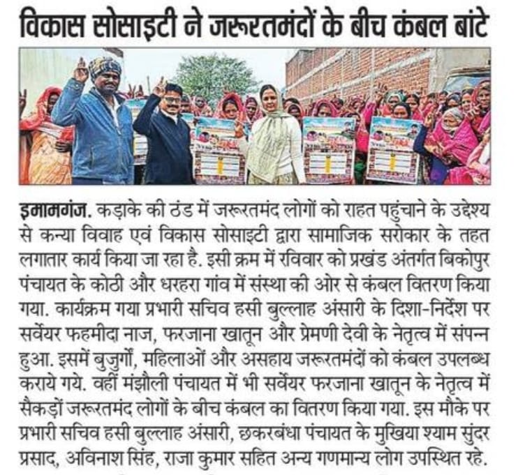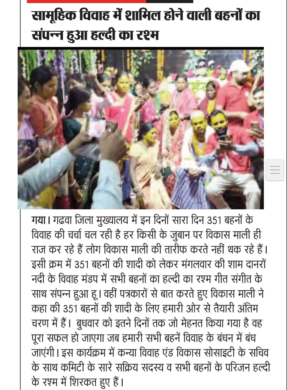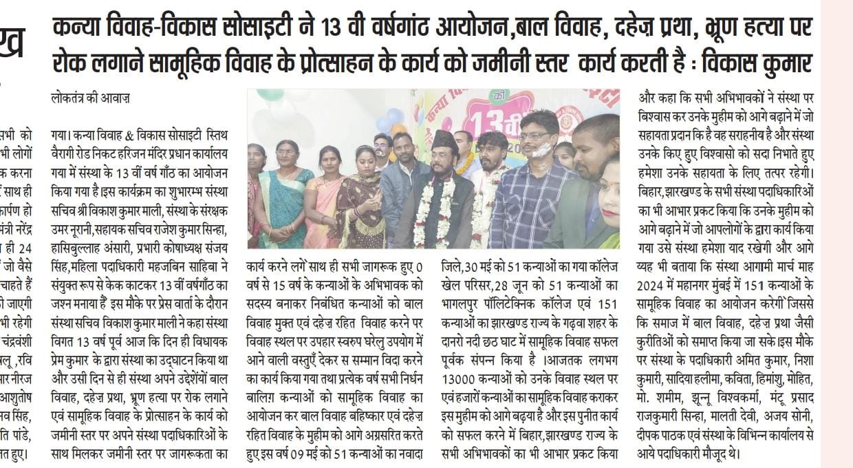 कन्या विवाह & विकास सोसाईटी द्वारा गया जिले के आमस प्रखण्ड में नवविवाहित कन्याओं के घर पर संस्था के प्रभारी पदाधिकारी संजय कुमार सिंह एवं सर्वेयर हिमांशु सिन्हा के द्वारा विदाई सामग्री